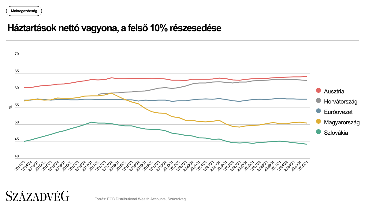 És most jön egy másik csattanó: a vizsgált időszakban, ezen belül 2018-tól Magyarország az az ország, ahol szignifikánsan csökkent a felső 10 százalék vagyoni részesedése. Szintén csökkenés volt Szlovákiában, miközben Horvátországban határozottan nőtt a leggazdagabb tized vagyoni részesedése. A pillanatkép is hasonló, mint amit korábban láttunk: míg Szlovákiában az egyenlőség, addig Horvátországban, Ausztriában és az euróövezetben az egyenlőtlenség nagyobb, mint nálunk.