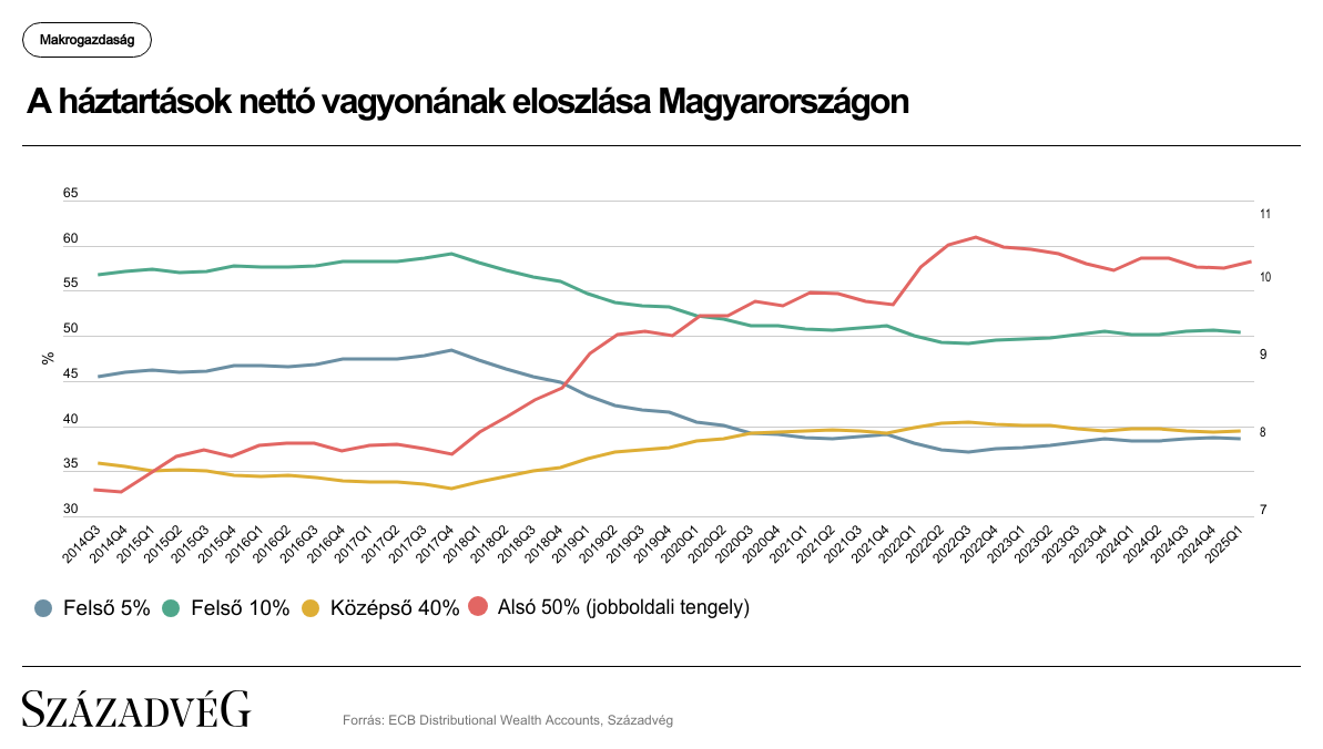 Jól látható, hogy százalékpontban a középső 40 százalék, saját induló helyzetéhez képest pedig arányában az alsó 50 százalék vagyoni részesedése nőtt a legjobban, miközben a felső 5 és 10 százalék részesedése markánsan csökkent. A fordulópont 2017 végén, 2018 elején volt.
