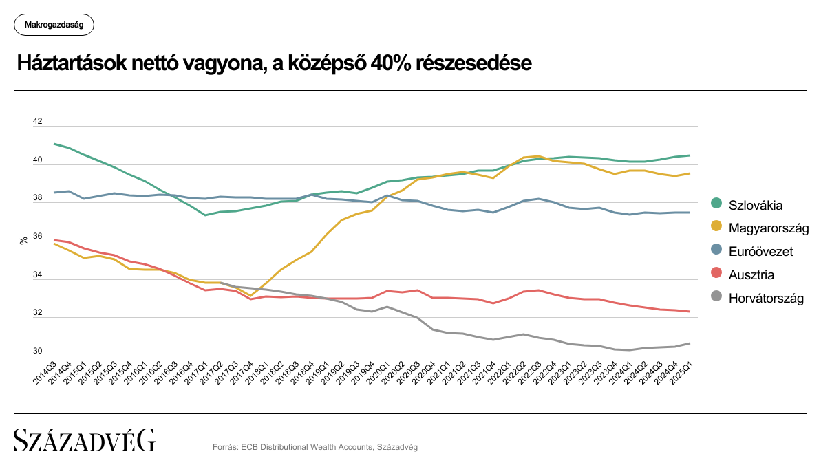 A vagyon szerinti 6-9. decilisben, amit itt középső 40 százaléknak nevezünk, még markánsabb a változás Magyarországon: 2018-tól a középréteg vagyoni helyzete erős dinamikával javult 2022 végéig, majd enyhe ereszkedés következett, de ezzel együtt is határozottan magasabb értéken zártuk az időszakot, mint ahogy nyitottuk. Szlovákia itt is előttünk jár, bár 2020 végére gyakorlatilag beértük, és jelenleg is csak kicsivel vagyunk mögötte. Minden más vizsgált relációban csökkent a középső 40 százalék vagyoni részesedése.